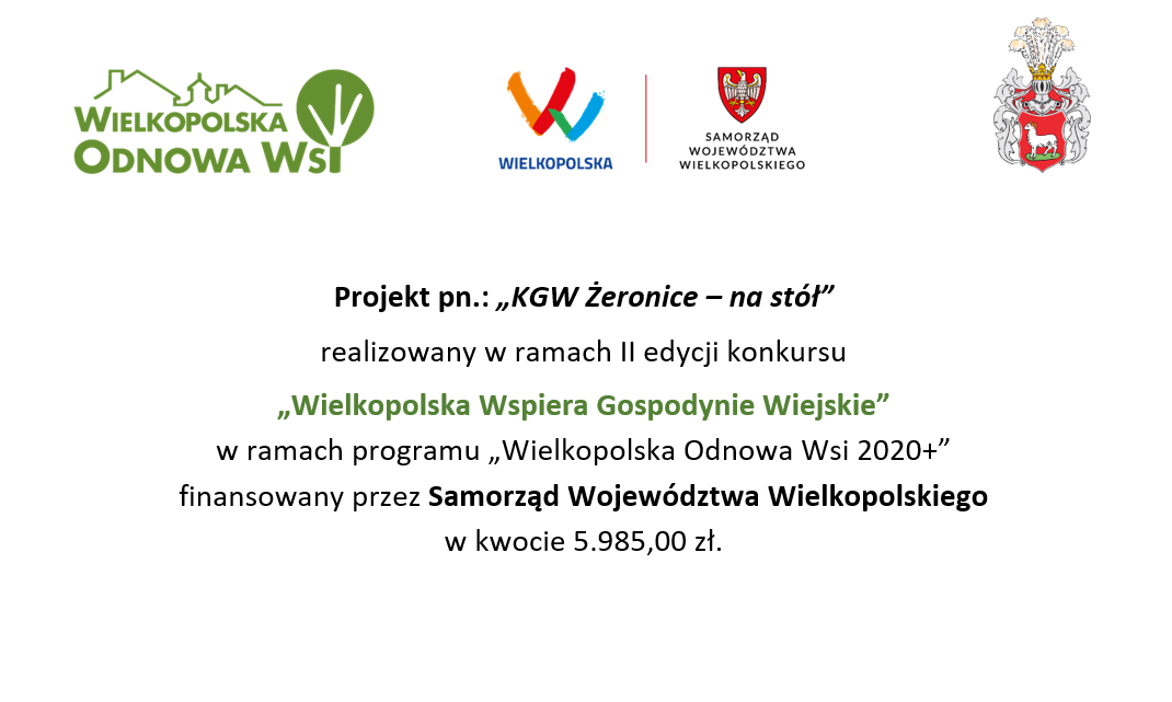 Realizacja zadania pn. „KGW Żeronice - na stół", finansowany ze środków Samorządu Województwa Wielkopolskiego w ramach konkursu „Wielkopolska Wspiera Gospodynie Wiejskie”.