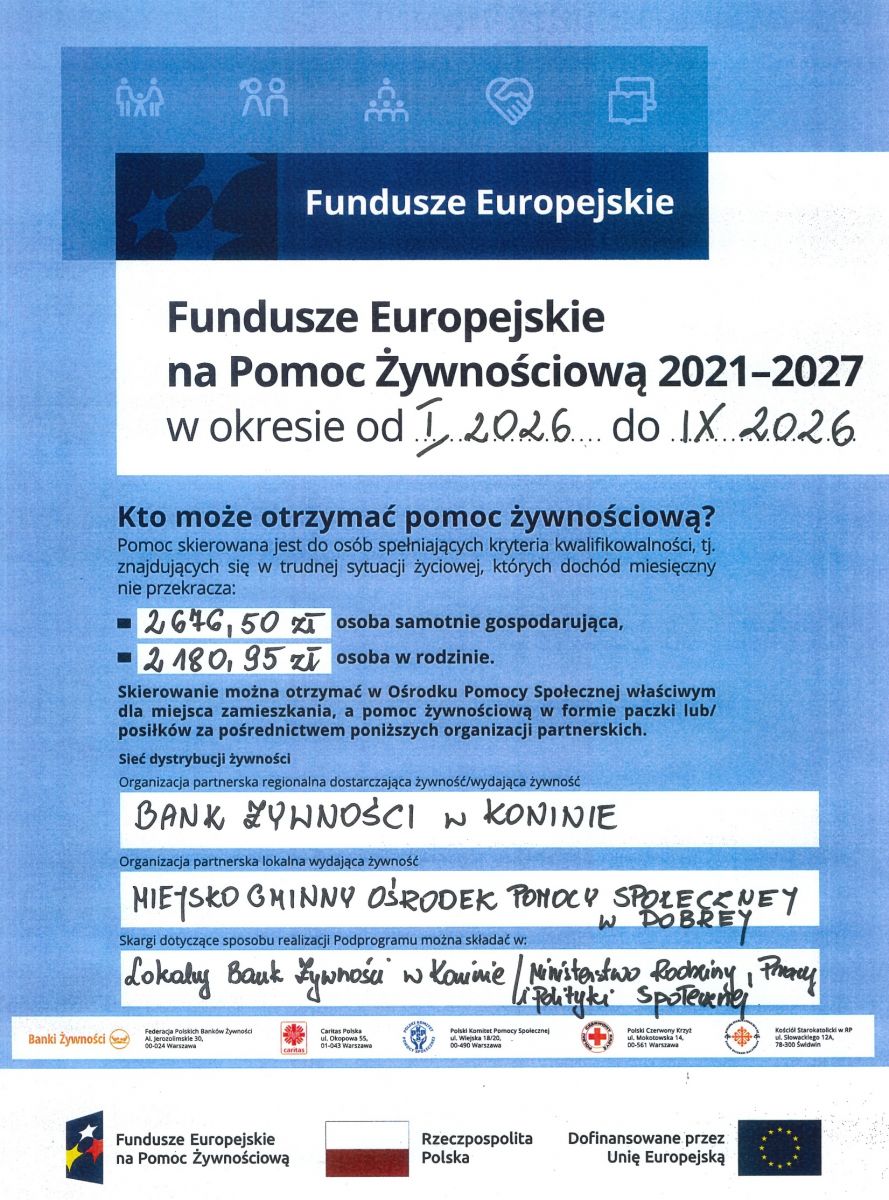 Osoby, które chcą skorzystać z pomocy żywnościowej w ramach realizacji przedmiotoego programu proszone są o kontakt z pracownikami Miejsko-Gminnego Ośrodka Pomocy Społecznej w Dobrej.